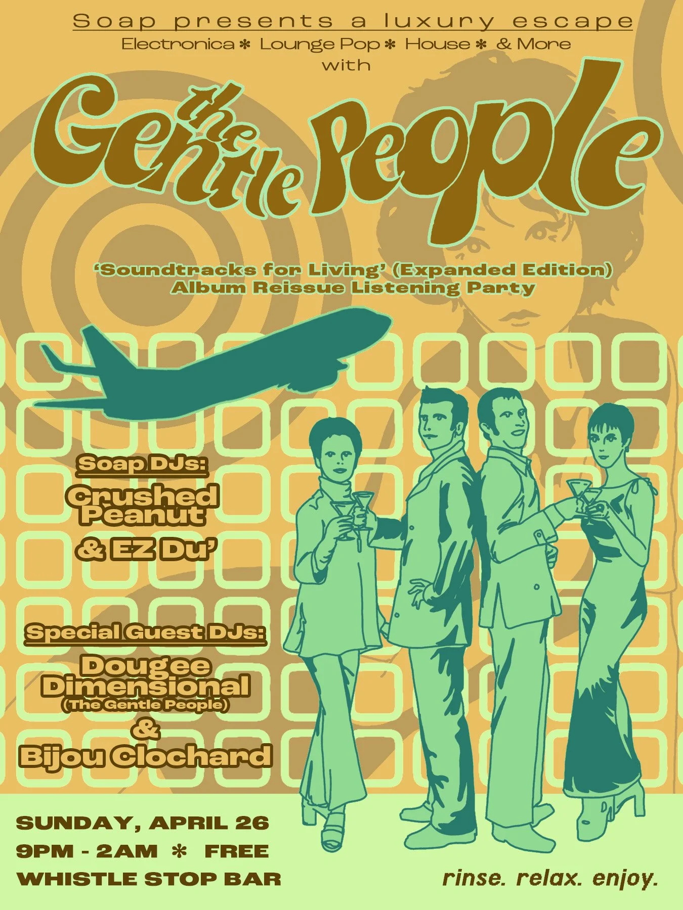 🫧 We’re taking you on a journey, through your body and through your mind!~ ✽ The refreshing world of ⓢⓞⓐⓟ is proud to present a simply faboo night celebrating the reissue of ‘Soundtracks for Living’, the debut album by the multinational 90s glambient lounge pop group The Gentle People, on Sunday, April 26 at San Diego’s Whistle Stop Bar. ‘Not to be missed’ is an understatement.